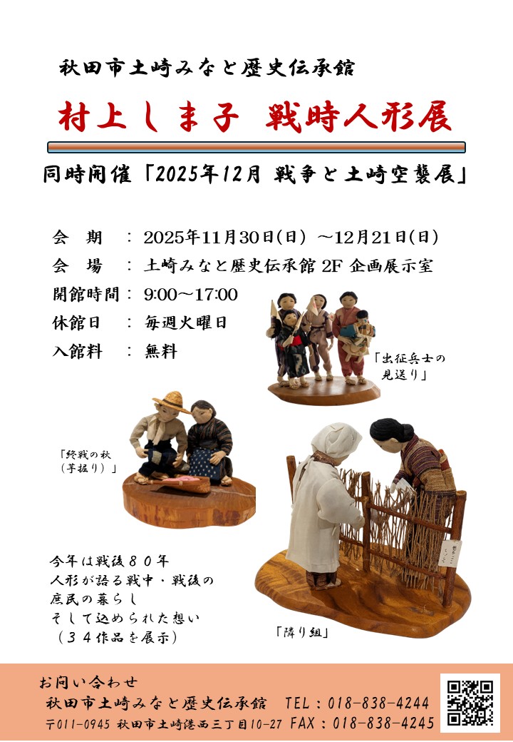今年は、太平洋戦争の終戦から80年にあたります。土崎みなと歴史伝承館では、土崎港被爆市民会議と協力して、土崎空襲を伝え平和について考える取り組みを進めてきました。その一環として、今回、戦時人形作家・村上しま子さんの作品を展示できることになりました。