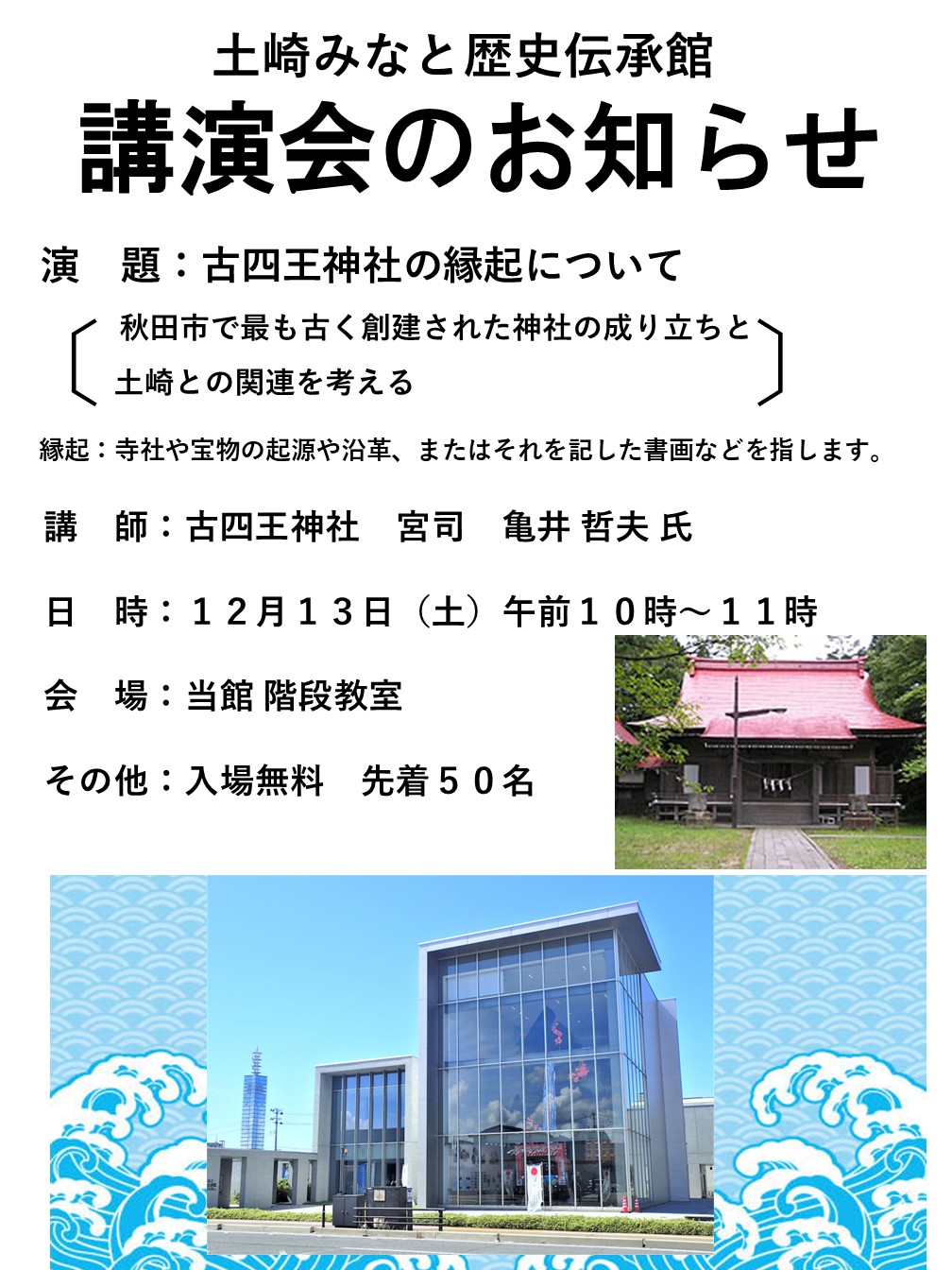 イベントトップ/おしらせトップ/お知らせ/イベント情報 講演会「古四王神社の縁起について」/12月13日(土) 2025年12月1日 今回の演題は「古四王神社の縁起について」 秋田市で最も古く創建された神社の成り立ちと土崎との関連を考えます 講師は、古四王神社宮司 亀井 哲夫 氏 です。